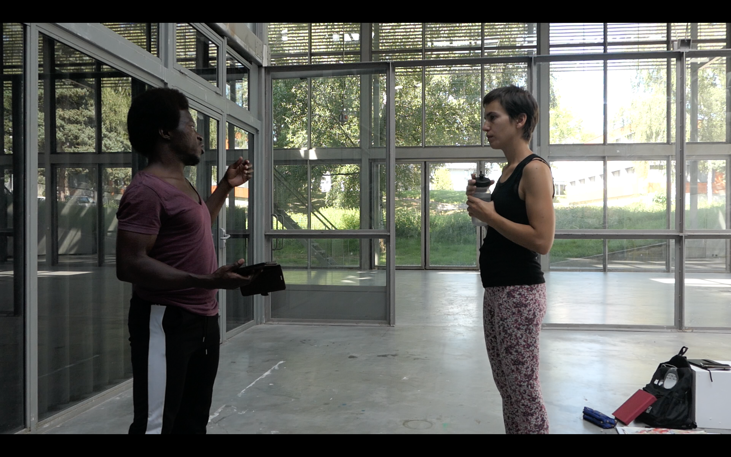 Dans Aristote kakabé, malgré les ténèbres de mes explications et leur surgissement souvent impromptu, je jouis d’un accompagnement dont je sortais indemne et renforcée. Forte de ce constat pratique, je décidai d’emblée de concevoir ma séquence pédagogique grâce et avec ceux dont les effets sur moi mobilisaient des ressources de persévérance et de plaisir. Ces effets ne me permettaient a priori pas de résoudre les difficultés que je rencontrerais dans ce nouvel exercice pédagogique, mais, si ce n’est de les voir, mes compagnons m’écouteraient toujours les leur décrire. Alexandre T., Zhuang Zhuang W., Yixuan S m’accompagnèrent, munis des gestes propres à leur discipline. Je fus de ce fait en mesure de me saisir au mieux de la liberté offerte par N. Perrier. Zhuang Zhuang W. et Yxuan S. vivent et étudient depuis deux ans à l’ENSAD Limoges. Originaires de deux provinces différentes, ils se sont rencontrés en Chine et Yixuan S. est arrivée en France une année après Zhuang Zhuang W. J’ai d’abord sollicité Zhuang Zhuang W. pour qui la pratique sportive est fondamentale dans la construction de son identité d’artiste. Travailler ensemble semblait couler de source. De plus, Il fut possible d’insérer mon projet de séquences pédagogiques dans le cursus scolaire de Zhuang Zhuang W. (en tant que stage) ce qui me permit d’assurer, sur un plan administratif du moins, des avantages à cette expérience. Il fut évident qu’Yxuan S. pouvait bénéficier aussi de ces avantages, du fait des difficultés scolaires qu’elle rencontrait, crées par les gouffres paralysants qu’un mauvais apprentissage d’une langue étrangère avait ouvert chez elle.