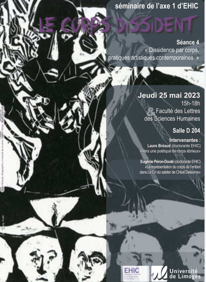 Un mot sur ces deux planches de chênes que j’appelle table de travail. J’ai commencé à y graver une fresque sans début ni fin au lendemain de la signature de mon contrat. En gravant, je cherchais le sens du mot « corps ébrieux », un sens au-delà du domaine médical duquel il ressortissait, caractéristique et singulier à ma pratique artistique tout autant qu’aux mouvements de mes pensées. Les premières modalités de recherche qui s’imposait à moi sans que j’y puisse y réfléchir consistait à camper une fresque sans début ni fin, peuplé de figures inspirés d’imaginaires dionysiaques et russes aux échelles diverses. C’était durant les premiers mois de l’année 2021. En 2024, j’ai confié ces planches à des enfants armés de pinceau, de rouge de jaune de vert et de bleu lors d’une des séances de ma première séquence pédagogique à l’école Montmaillet et au stade Beaublanc de Limoges. Au lendemain des envoi postaux de ma thèse, j’ai repris cette gravure, comme une partie d’échec qui avait été mis en suspend. A moi de jouer ! Etre à présent au travail sur cette gravure fait s’entrecroiser dans une conscience et un ravissement nouveau le jeu, le dialogue, l’apaisement paradoxal du jamais fini, le plaisir de la table. Dessus, dedans, tout autour, mon corps ébrieux fait de cette table sa poétique. Mon amie Dorothée viendra documenter ce moment, indiquez moi en levant la main si vous ne souhaitez pas apparaître sur les photos. Mon fils Valdo et mon amie Clem enregistreront durant ces quelques instants des vidéos diffusées en direct, auquel je l’espère Vero Leduc et Sara Houle auront accés. Mais avant ce moment poïétique, je lirais quelques mots.
