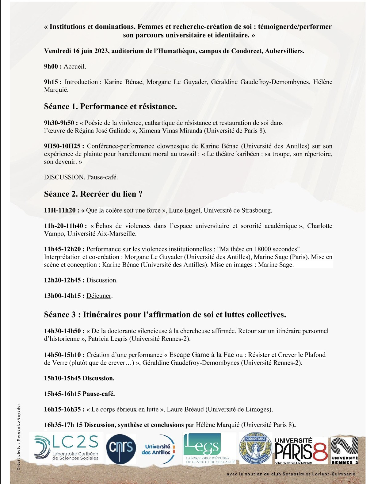 Mon entreprise est marquée par des « savoirs incorporés » (Ville, Fillon et Ravaud, 2020) déterminés d’une part par les effets d’un handicap d’ordre neurologique et de l’autre par le mélange de savoir-faire acquis dans l’enfance. Pour parvenir à apprivoiser ma « démarche ébrieuse » et « l’explosivité de ma parole » (termes neurologiques), j’ai approfondi les notions d’altérité, de dialogue, et la force spécifique de l’amie en tant qu’altérité idéale. Enraciné dans le personnel et dans « la singularité extrême » (Marx, 2023), cet approfondissement m’a conduit à fréquenter, par l’écrit et par la pratique (performances, ateliers pédagogiques) des « bords au-delà duquel la pensée se brise » (Schwab, 2010). C’est sur ces bords qu’œuvres, liens avec les vivants et écriture se sont amalgamés et ont pu faire d’une thèse de Recherche-création, la Poétique de corps ébrieux.