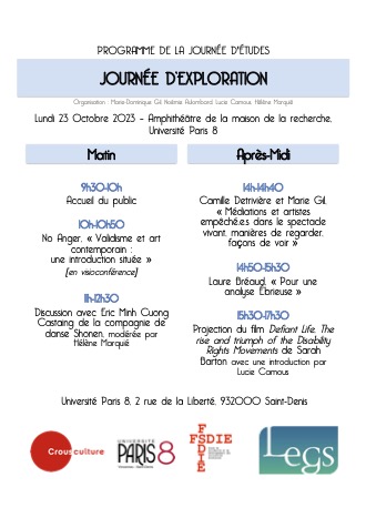 Atteinte d’une pathologie neurologique inconnue, ces deux états du corps imposé par les usages de deux pratiques me sautaient d’autant plus aux yeux que chez moi, l’un exigeait pour se faire que je chasse l’autre. Sinon je perdais la boule, ou plus sérieusement, je perdais l’équilibre et me mettais en danger. En 2021, lire et écrire nécessitait que je muselle ou corrige drastiquement ce dont je tirais parti dans le domaine artistique : ma vision double, mes gestes maladroits, mon déséquilibre continué me permettant à brule-pourpoint d’éviter la chute. Je parvins année après année à trouver les modus vivendi pour que cohabitent deux activités où voir, écouter et toucher, exercer sa motricité fine exigeait des compétences parfois contradictoires. Entre maîtrise, rééducation, organisation d’un côté et désordre, instant et adaptation bricolée de l’autres, je pus trouvé mes repères, faire -poiétiquer- et écrire grâce aux forces de l’amitié et l’élan généré par la puissance des effets de rencontres variés et renouvelés. Le soutien de mes directeurs et de la cellule handicap de l’université de Limoges me furent précieux.