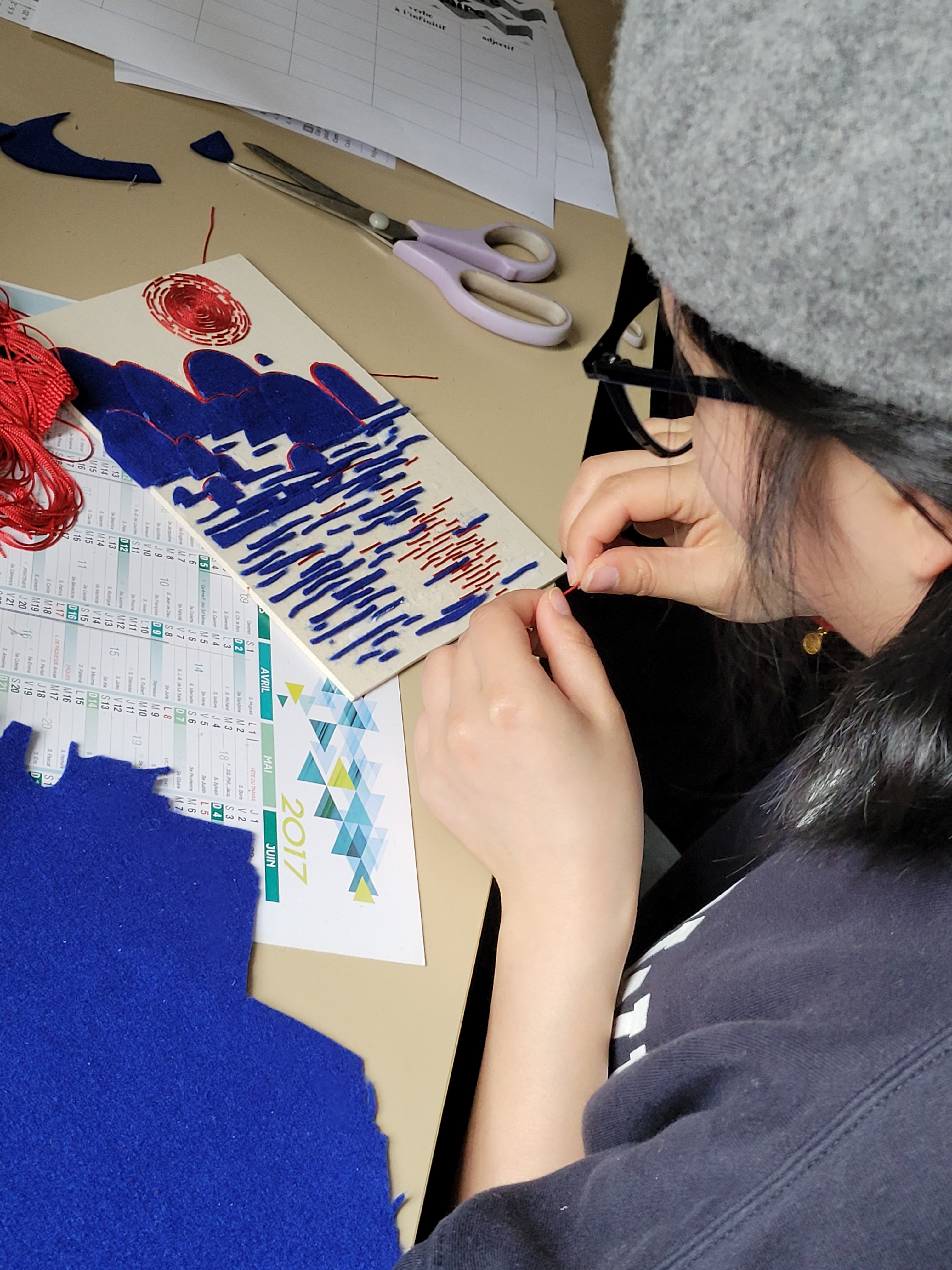 images de captures d’écran des vidéos, ainsi que des photographies de mes ateliers pédagogiques réalisées au cours de mes trois années doctorales. Après les devoirs familiaux, reprises invention, improvisation se mêlaient inextricablement dans une série de trente-six dessins. Je consacrais à chaque atelier six dessins. Dans chaque dessin, je travaillais à mêler cinq pistes, tracées par des outils différents : fusain, crayons de couleurs, stylo d’encre noir, fil rouge et petite figure collée, le fantôme de mon amie, représentée comme une poupée à la jupe de feutrine bleue. Trente-six dessins pour acquérir des techniques neuves, ou éveiller d’anciennes habitudes du corps.