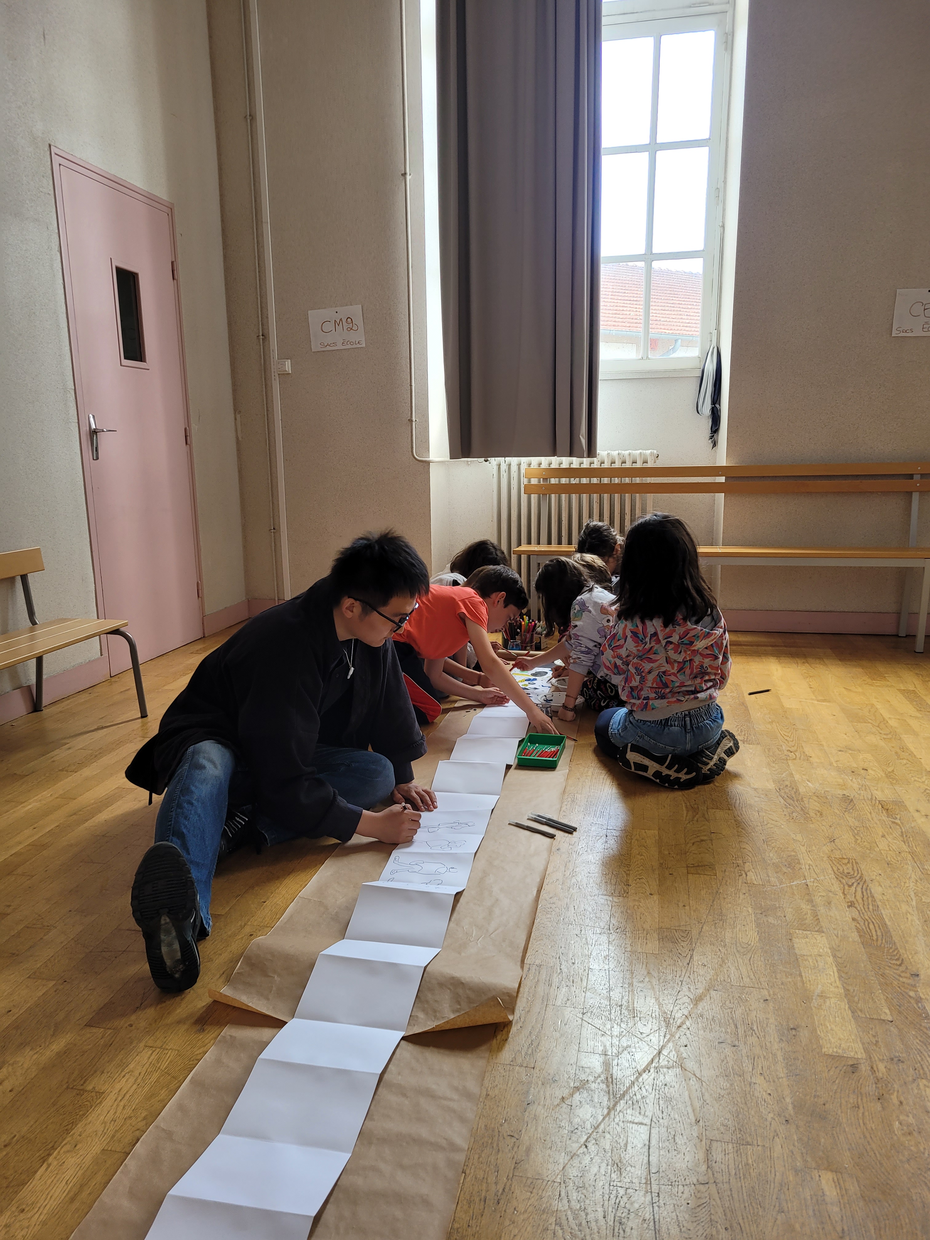 En prenant appui sur l’expérience de la mort et du deuil nous servait de zone commune de partage, à peine troublée de mots, apaisante. Les échanges d’expérience que j’eu avec Zhuang Zhuang W. à propos de l’enfance et de la pédagogie me permirent d’orienter les deux premières séances de la séquence pédagogique. En me décrivant l’apprentissage du ping-pong en milieu scolaire, et celui de la peinture et du dessin au sein des institutions équivalentes à nos écoles supérieures d’art, Zhuang Zhuang W., et Yixuan S., également formée au dessin et à la peinture de style académique occidentale (réaliste), me permirent de construire mes premières interventions : la virtuosité de mes amis et l’habitude à performer par le dessin en public pouvaient constituer un pôle de fascination, de méditation ou de rêverie bienvenu auprès des enfants. J’avais également comme allié le professeur de boxe anglaise Alexandre T. J’ai sollicité Alexandre T. dès le début de ma thèse, en tant qu’interlocuteur passionné et actif dans plusieurs disciplines. Dès qu’il fut question de m’exposer publiquement en tant que corps ébrieux, Alexandre s’exposa à mes côtés. Sa présence et sa performance, qui aurait pu mettre en exergue à mes yeux mon corps en tant que corps pathologique, gauche, affadi, eût sur moi un effet tout inverse. Alexandre me permettait de me déprendre de toutes velléités de construction identitaire, ouvrant la voie à un hédonisme où prendre et recevoir des coups étaient énigmatiques et source de questionnements vivifiants. Pharmacien, musicien, danseur et bon buveur, il savait doser son explosivité dans de nombreux domaines toujours en adéquation avec les autres. Enfin, la photographe Dorothée Davoise, amie du temps de ma formation à l’ENSBA de Paris (Ecole Nationale Supérieure des Beaux-Arts de Paris) pu également intégrer le projet, m’offrant le luxe de laisser suspendu la signification de sa présence à mes côtés – jusqu’à ce que je puisse, en m’appuyant sur le travail photographique qu’elle me fournirait -, en trouver le sens. Nathalie P. et Séverine S., AESH (accompagnante des élèves en situation de handicap), en tant que premières responsables de la classe, complétèrent le groupe d’adultes auprès duquel toutes craintes d’être entravée par mon environnement lors de mes interventions étaient levées.Ainsi entourée d’une équipe réelle, attentive à ma parole et présente le jour J, je pus errer parmi mes souvenirs pour laisser advenir quelques mélanges.