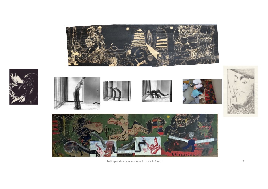 La Poétique de corps ébrieux se fonde sur deux réflexions, l’une énoncée par W. Marx au sujet de l’importance de la place du corps dans la Poétique d’Aristote (Marx, 2015), l’autre sur le développement que P. Bourdieu propose de la célèbre formule de Durkheim « L’art est une pratique pure sans théorie » (Bourdieu, 2002). Comment, en tant qu’artiste, tirer parti de ces deux analyses ? Peuvent-elles éclairer ce qu’un artiste peut dire de ses manières de créer, quand celles-ci nécessitent pour exister de se retirer de « l’ordre de la langue » (Canut, 2021) ? Poiein signifie faire, et les artistes devraient peut-être s’en tenir à leur pratique, sans se risquer à la glose.